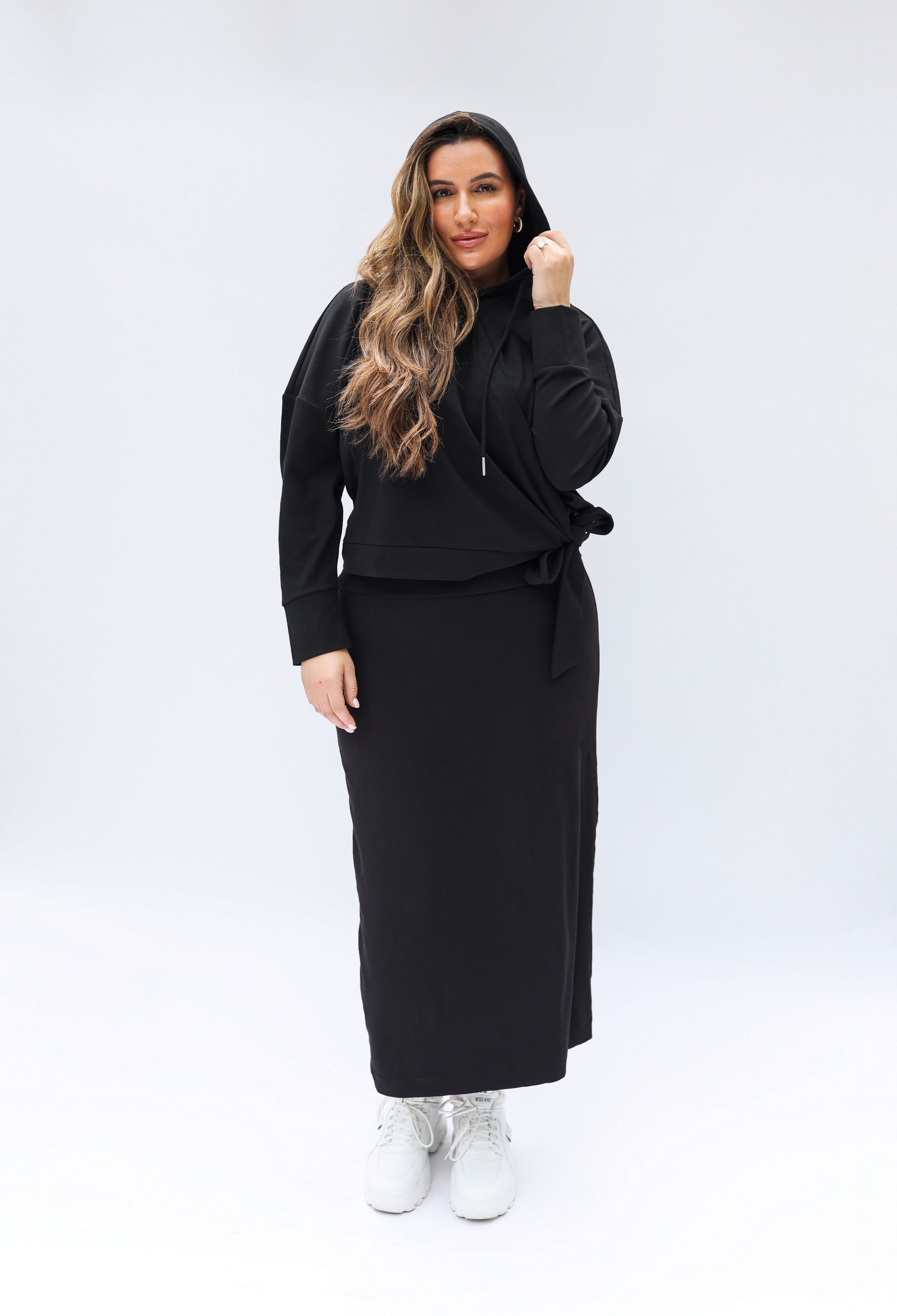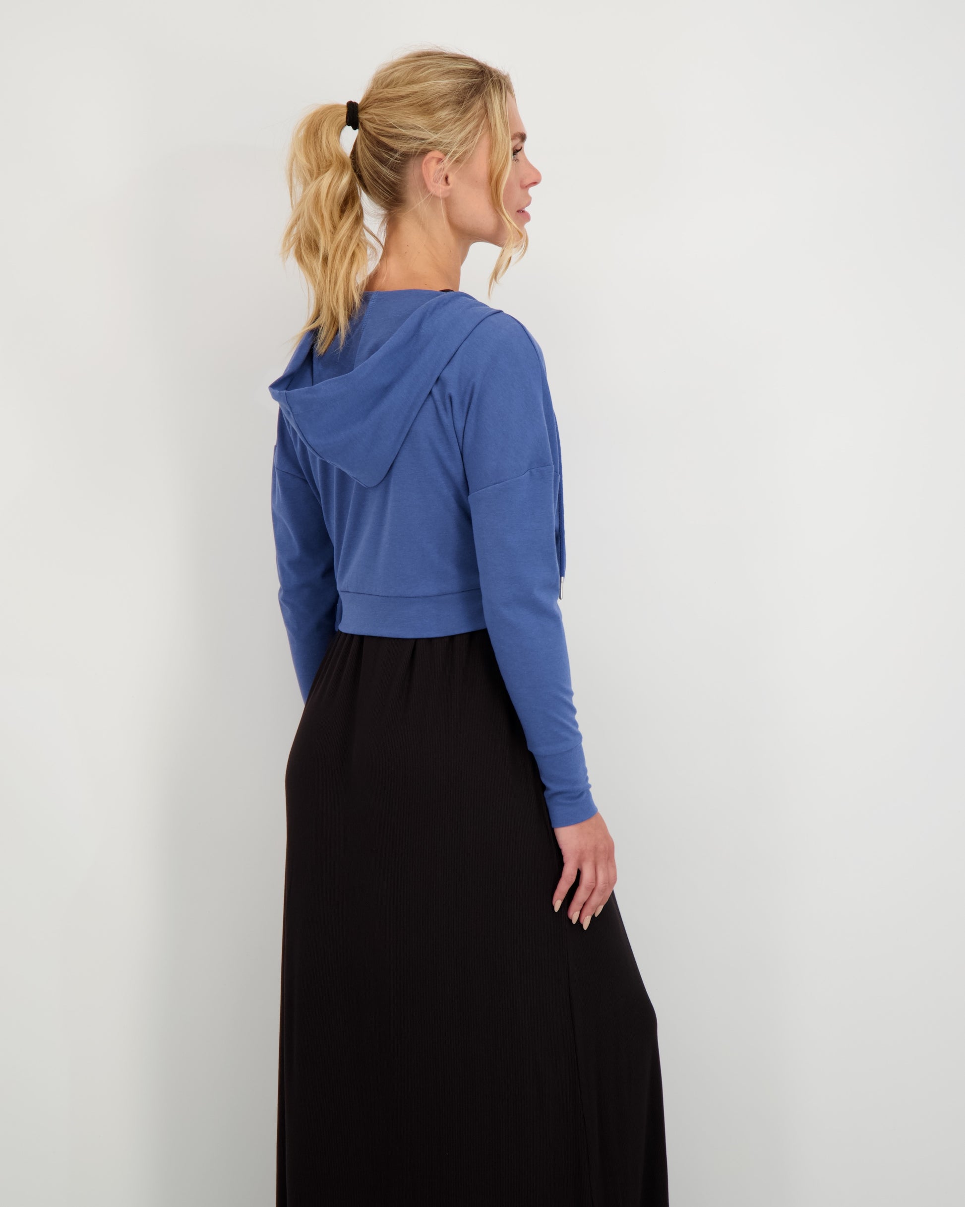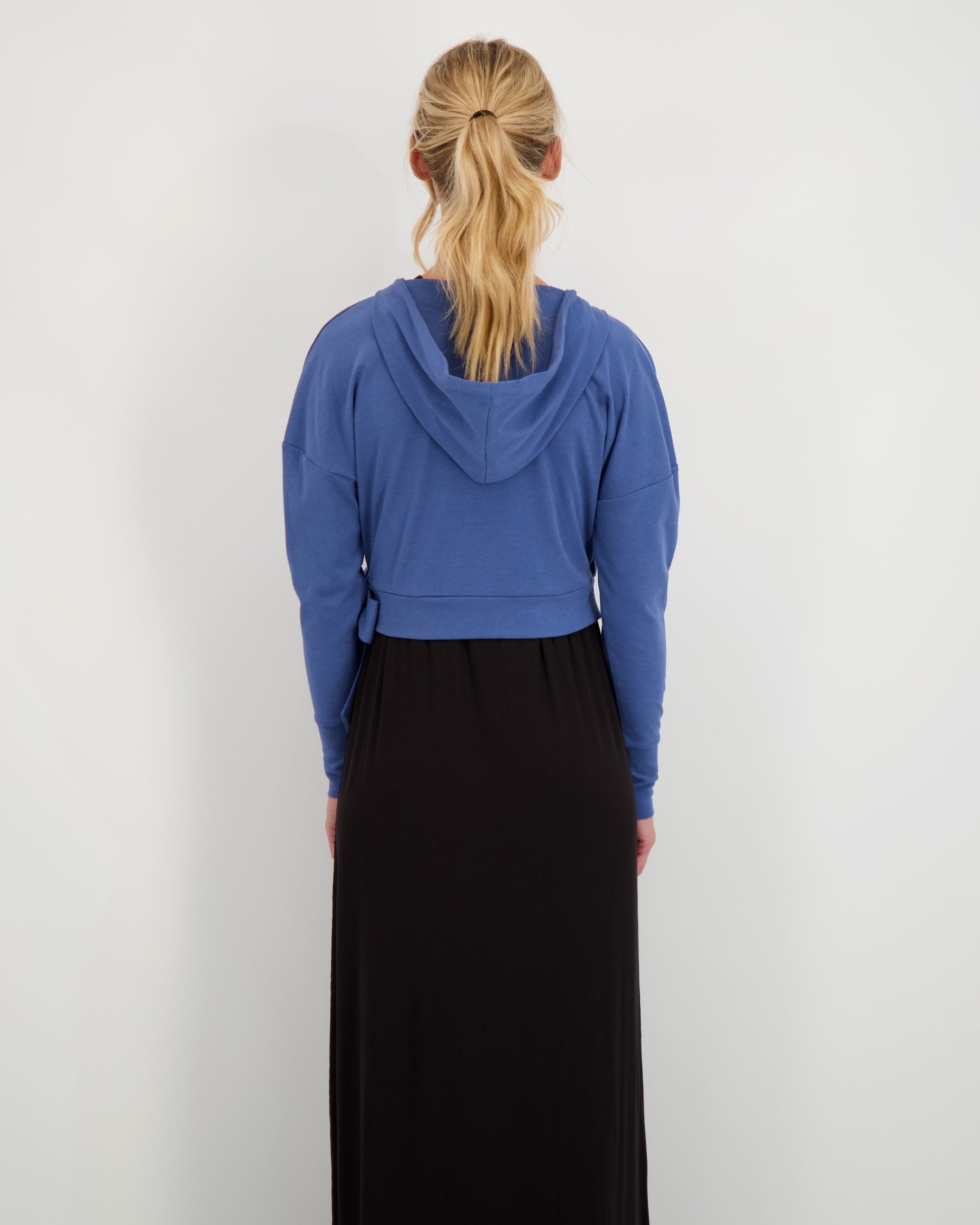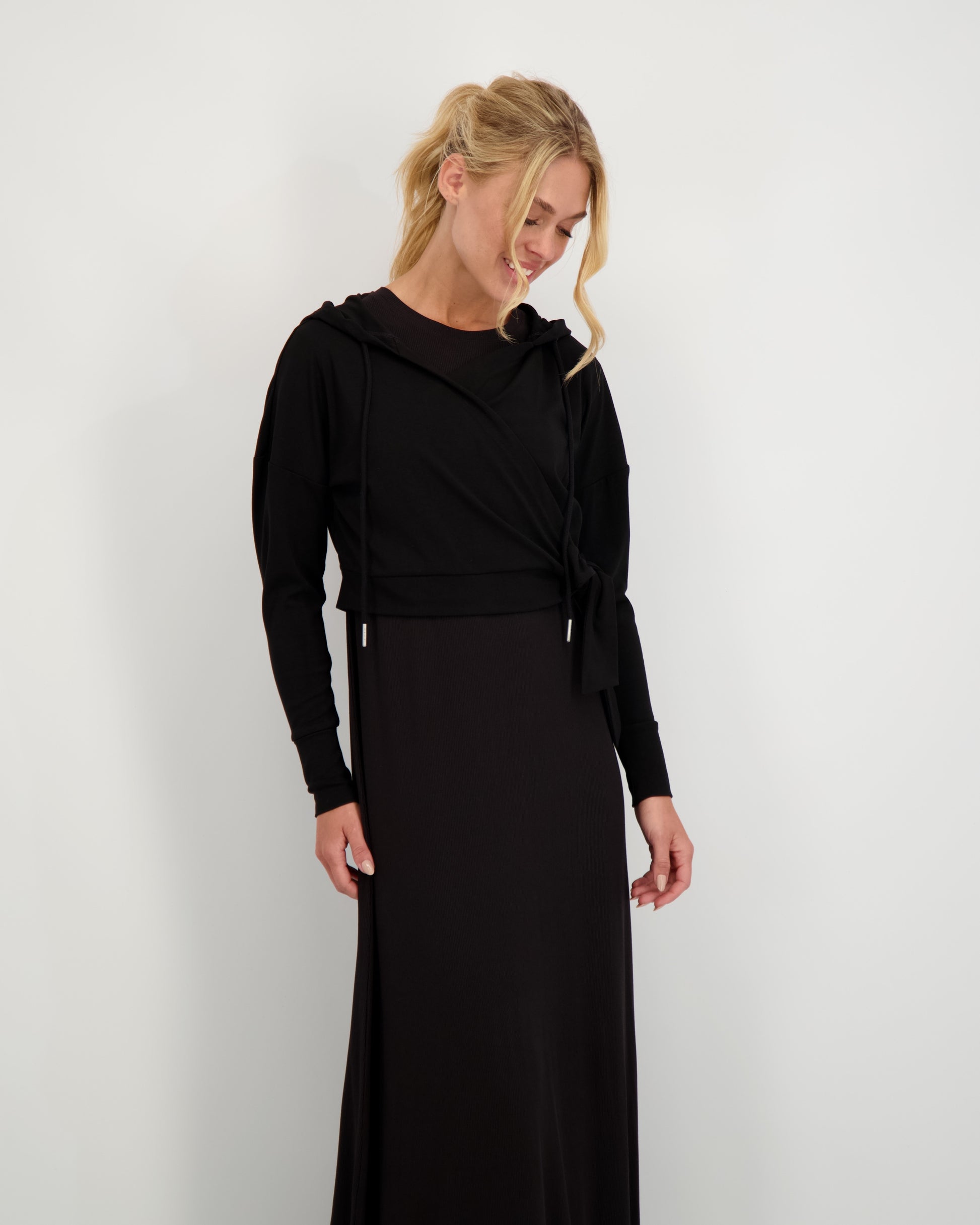 The Tokyo Top is a chic wrap tee made from our soft, breathable bamboo jersey fabric. Featuring a hood and one-sided wrap detail, it’s designed to flatter and move with you. Perfect on its own or layered over the Paris Dresses, it’s also bump-friendly—sitting beautifully over your baby bump.