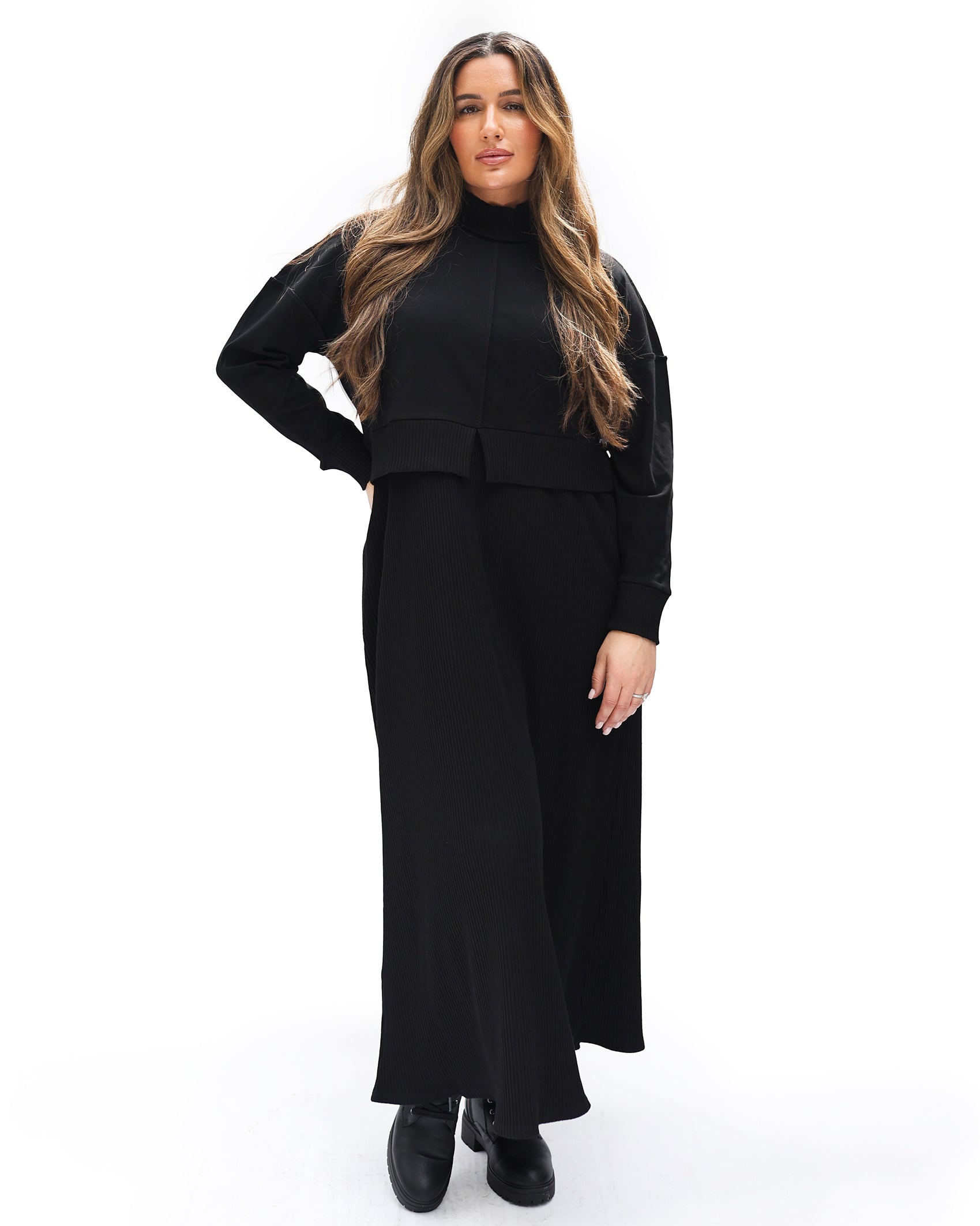 Designed with a modern reverse seam, this style features a ribbed mock neckline, cuffs, and hem for a clean, polished look. A subtle front hem slit adds shape, while the buttery-soft fabric makes it the perfect layering piece to pair effortlessly with our Wide Ribbed Sleeveless Dress.