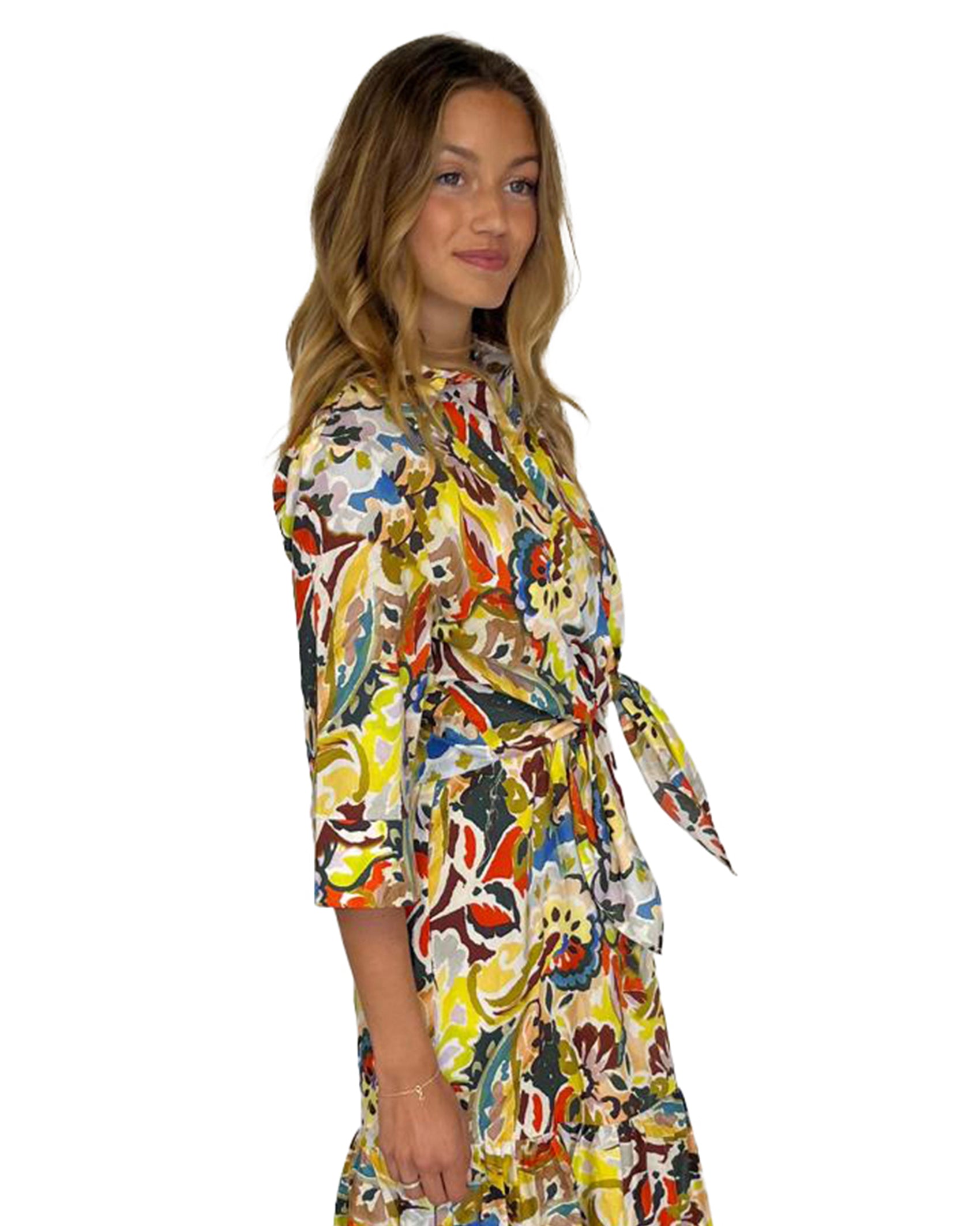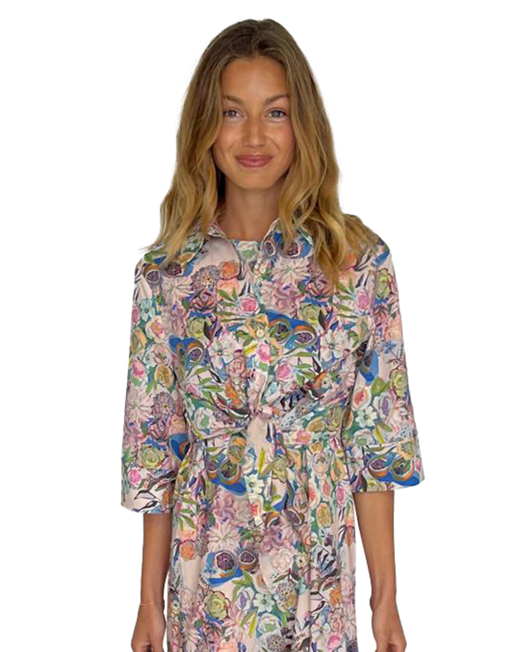 The Tied Crop Blouse is a fresh, lightweight top that brings easy charm to any outfit. It features a button-down front with a flattering tie detail at the waist, cropped length, and cuffed ¾ sleeves.