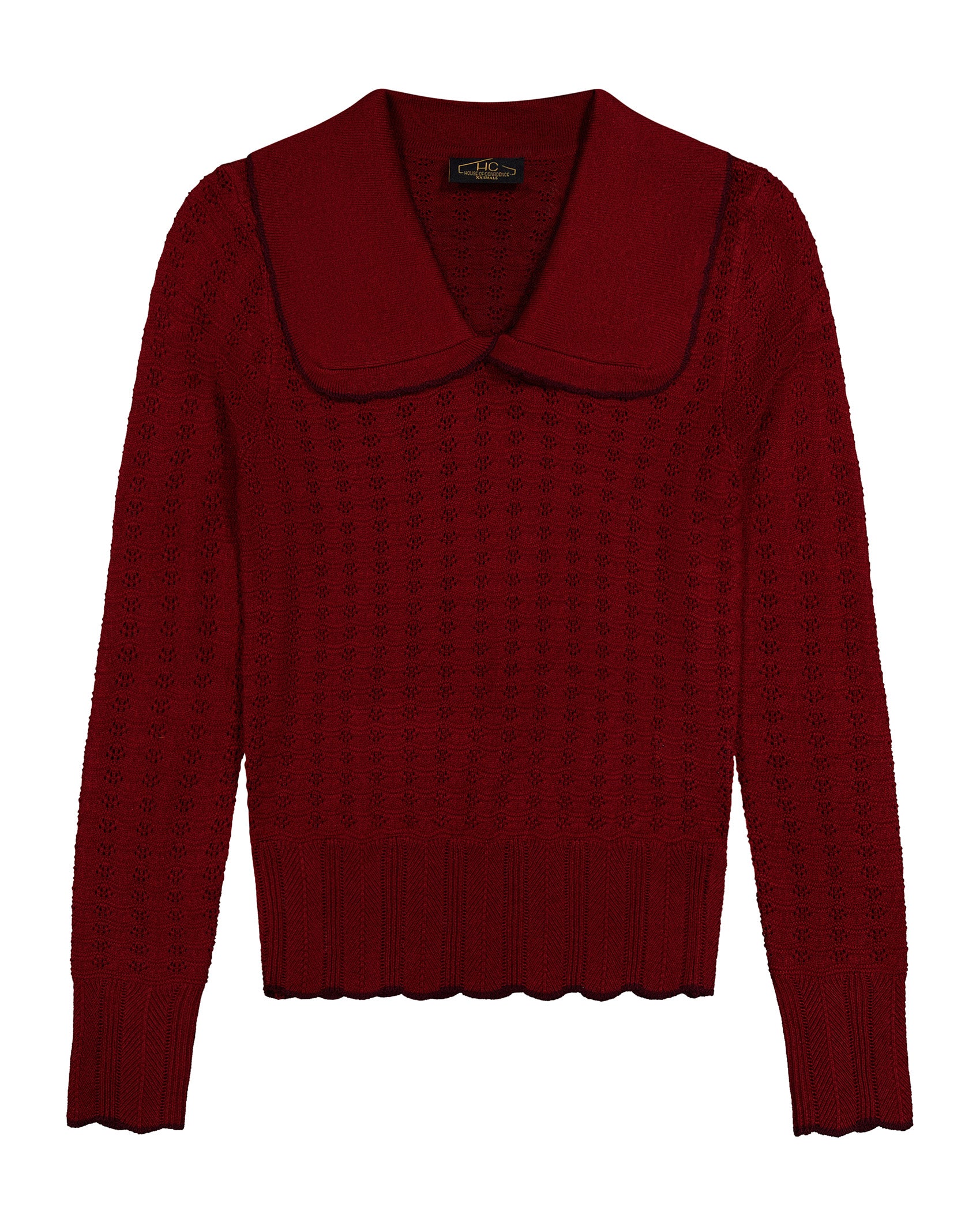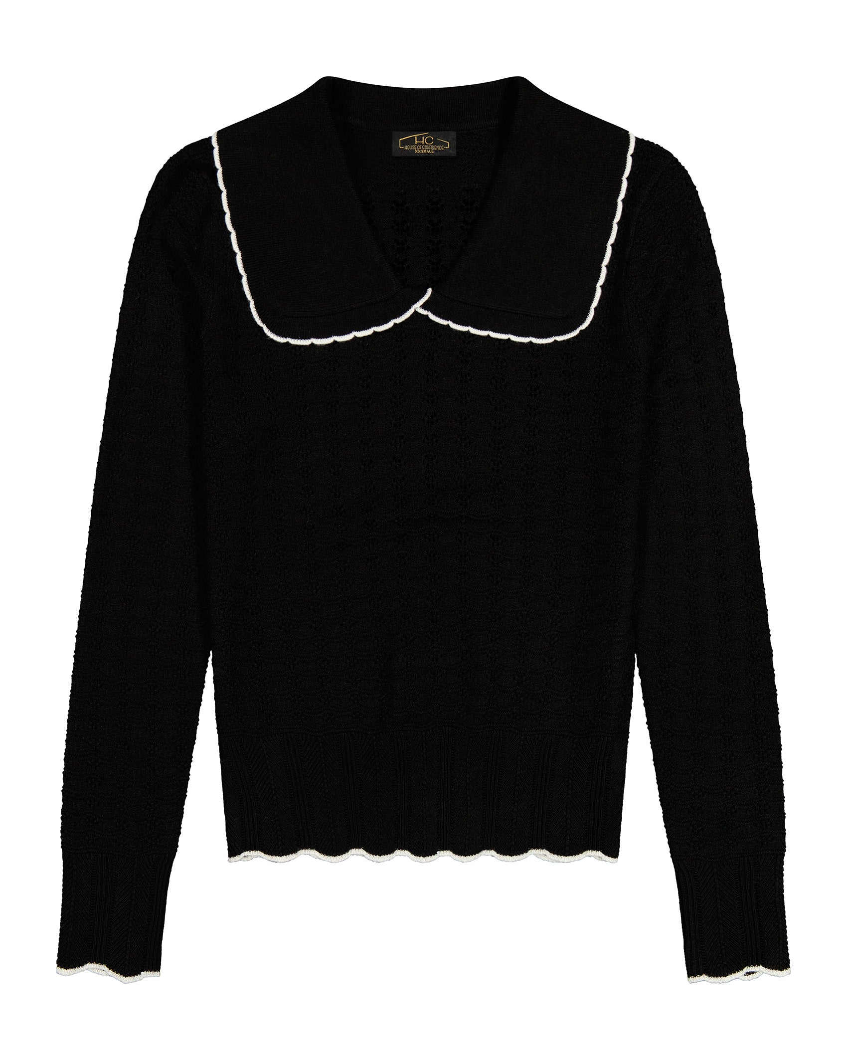 This charming knit sweater blends vintage-inspired details with cozy texture. Designed with a contrast-trimmed collar and allover textured knit, it’s finished with a wide ribbed hem and scalloped edges for a soft, feminine touch.