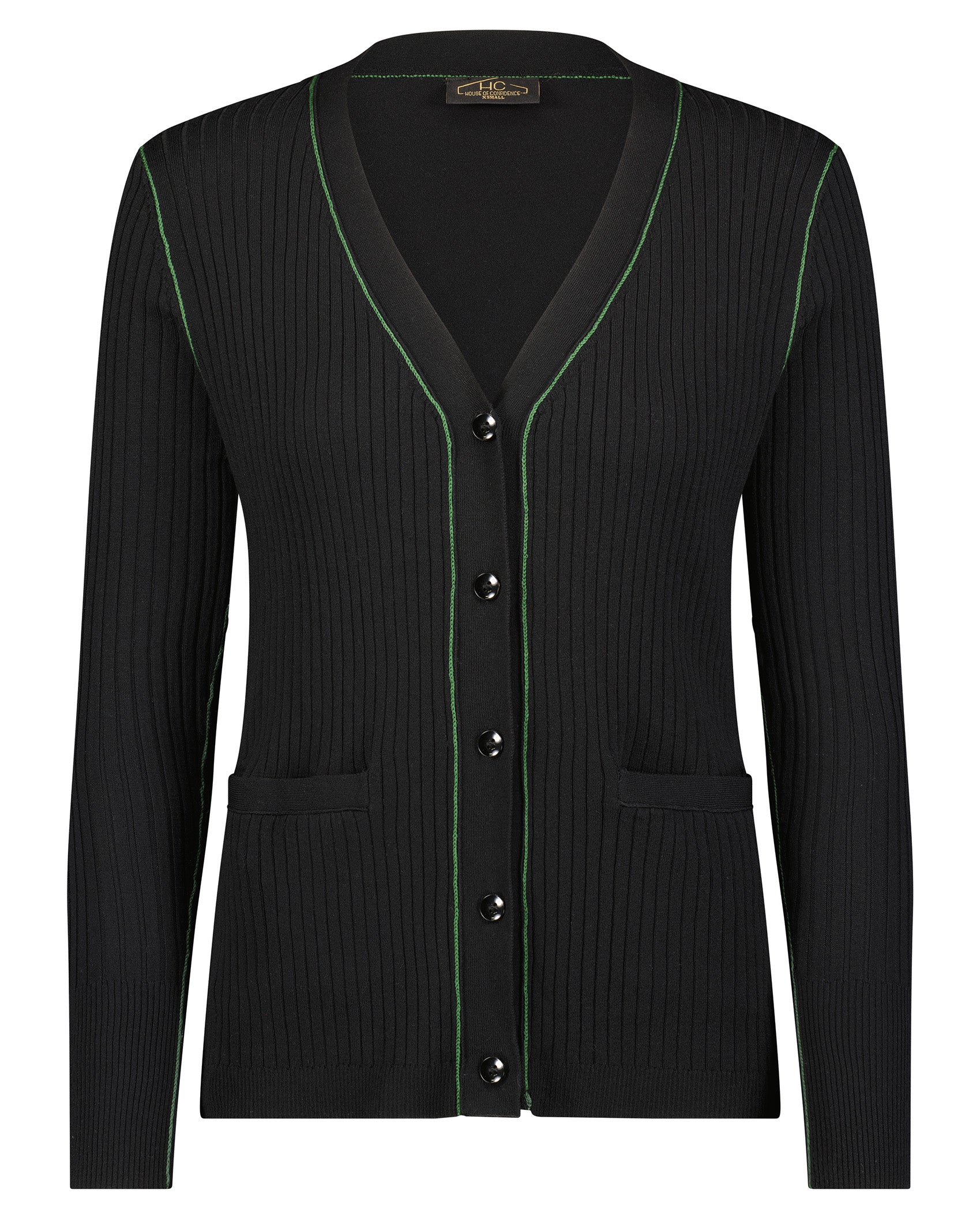 Super lightweight cardigan. Wide set ribbing and color edged detail.