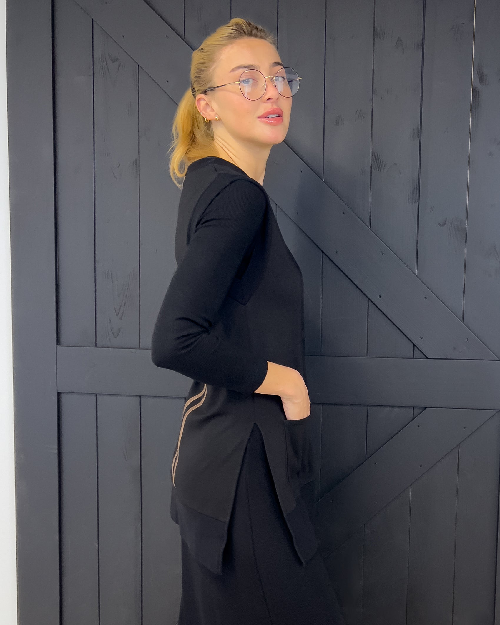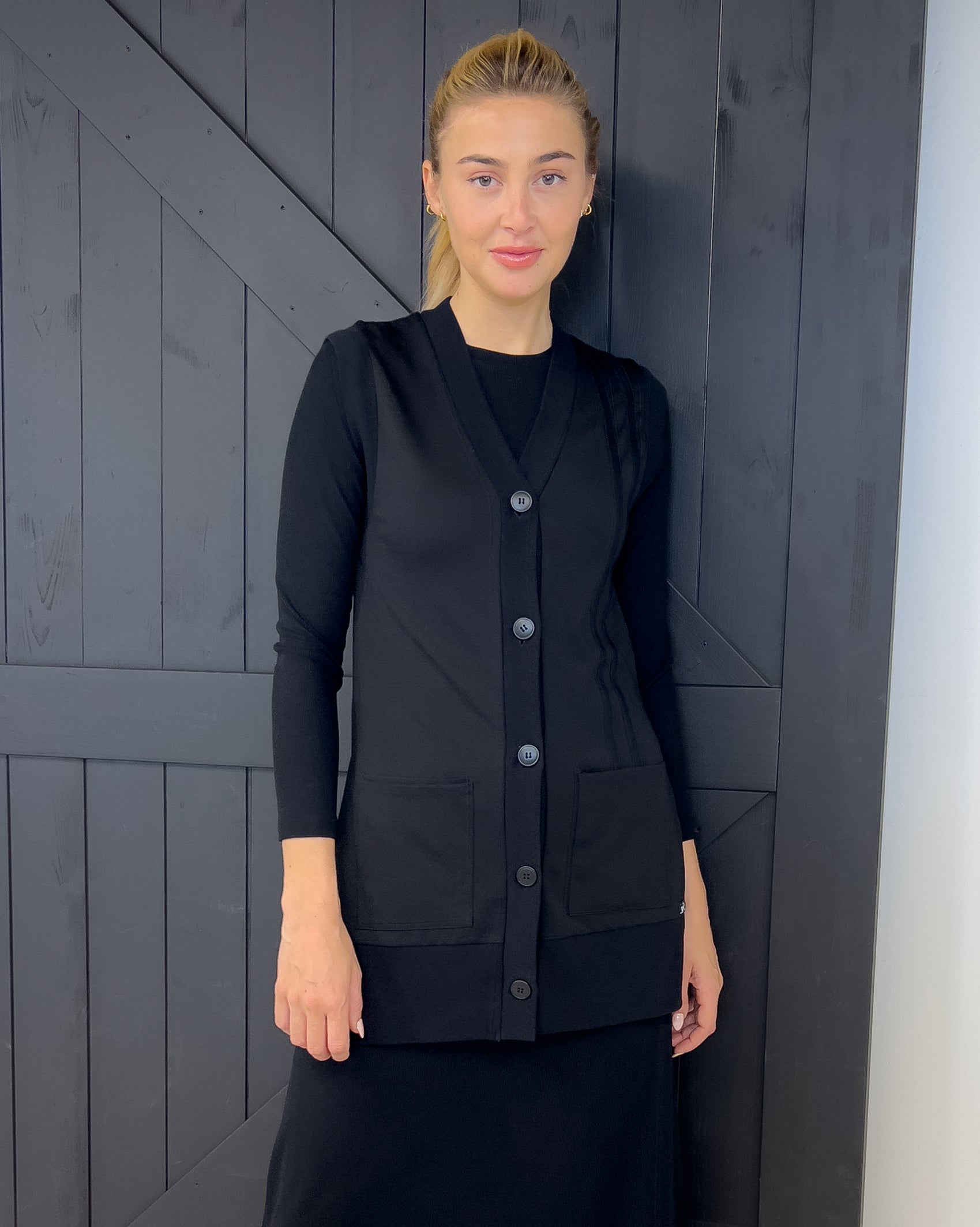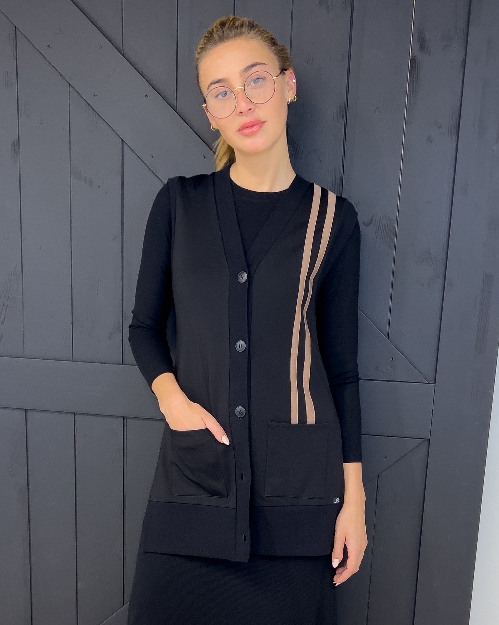 A longer-length sleeveless vest in our cozy flat jersey. Features a deep V-neck, full button front, ribbed trim at the placket, armholes, and hem, plus two front pockets. Finished with sporty side stripes for a clean varsity feel.