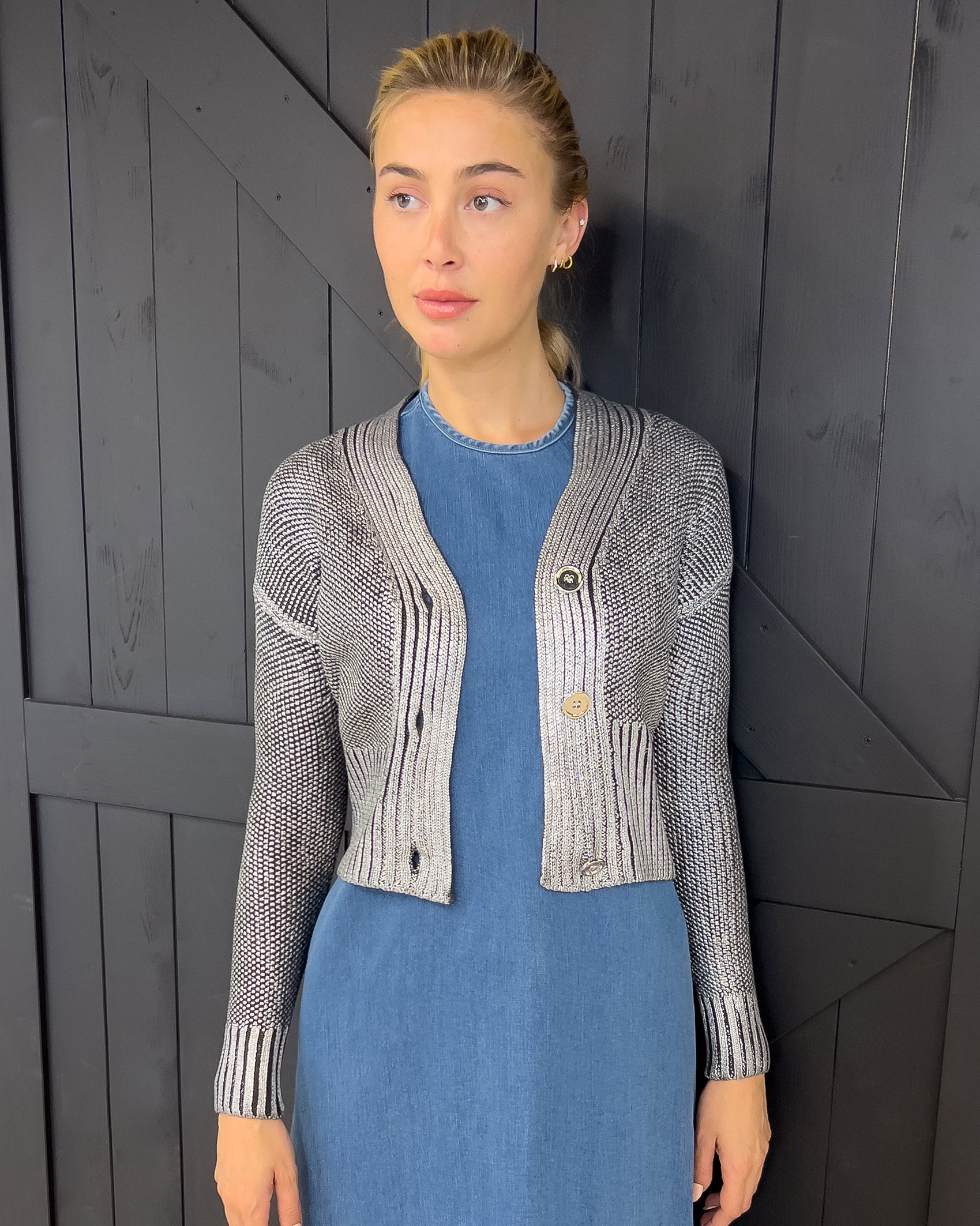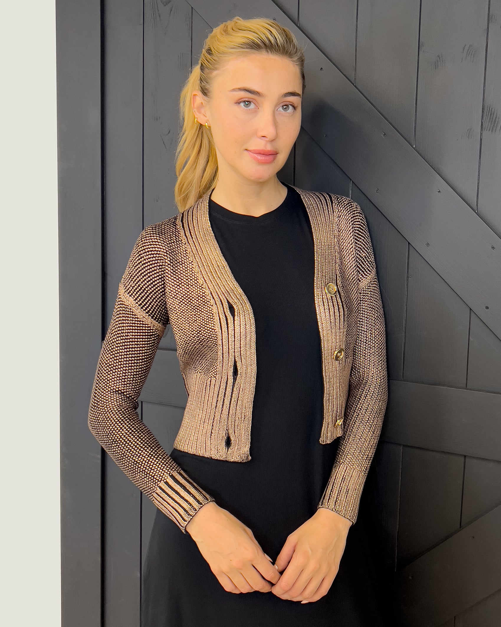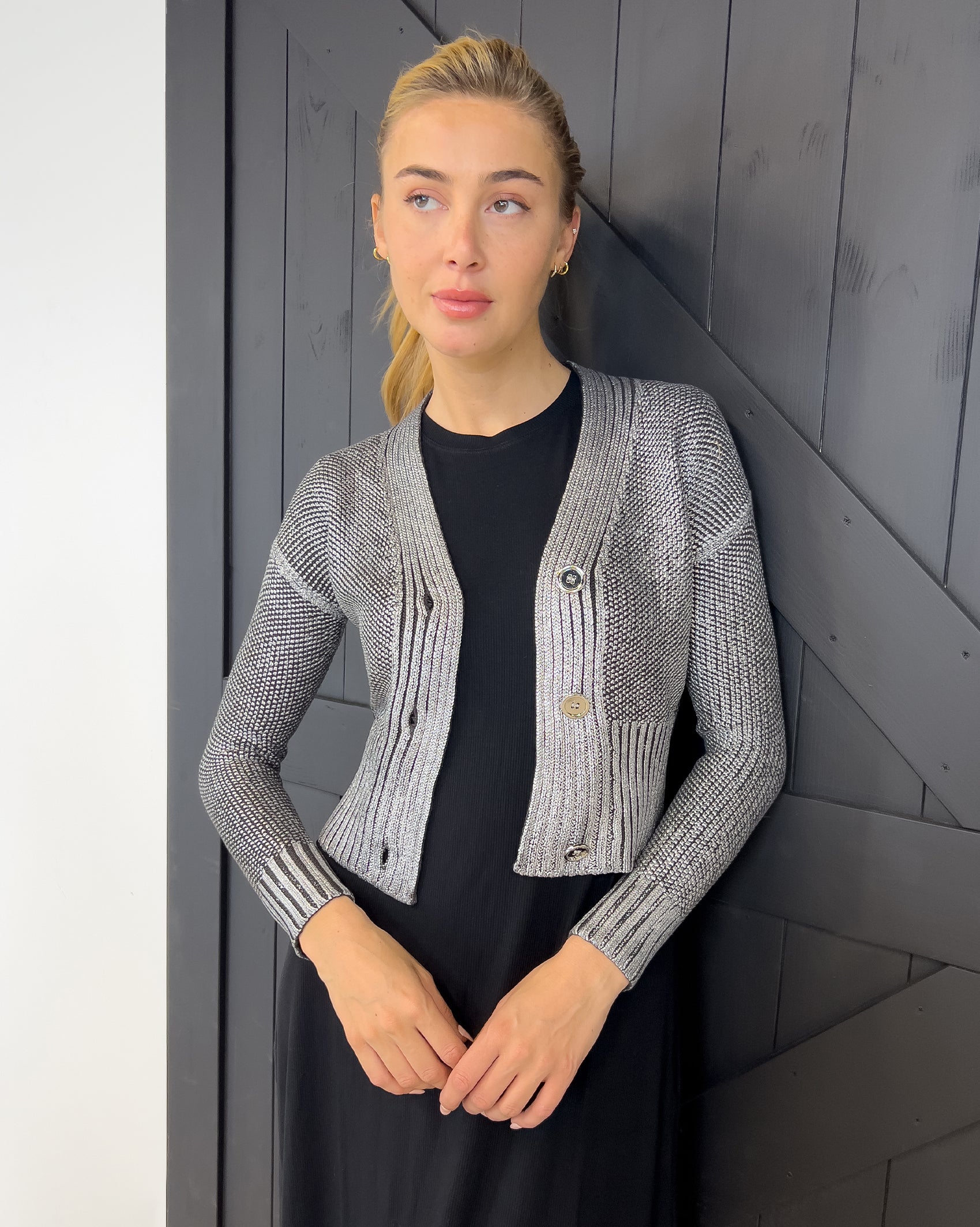 A statement knit with a painted finish, this short cardigan blends texture and shine for a bold yet wearable look. Designed with a flattering V-neckline, front button closure, and ribbed detailing at the hem and cuffs for structure.