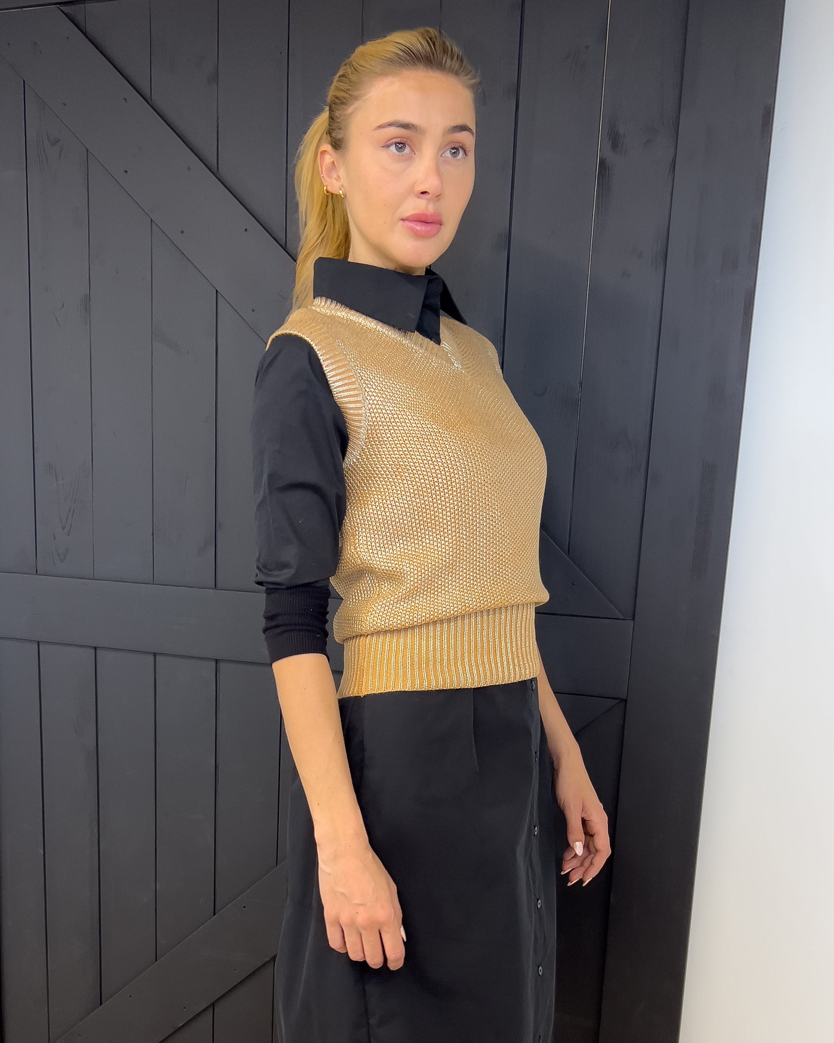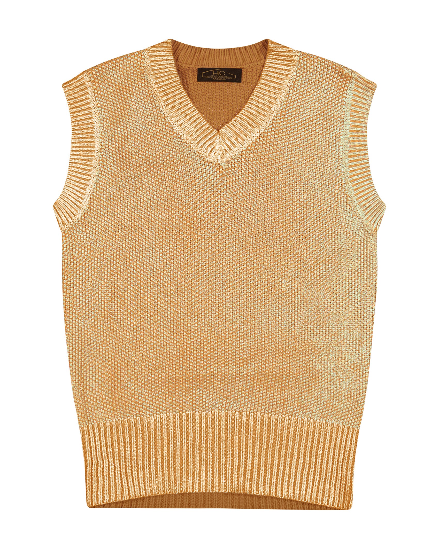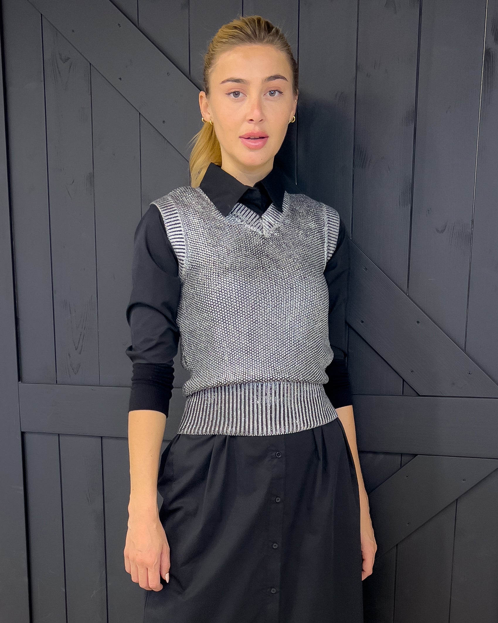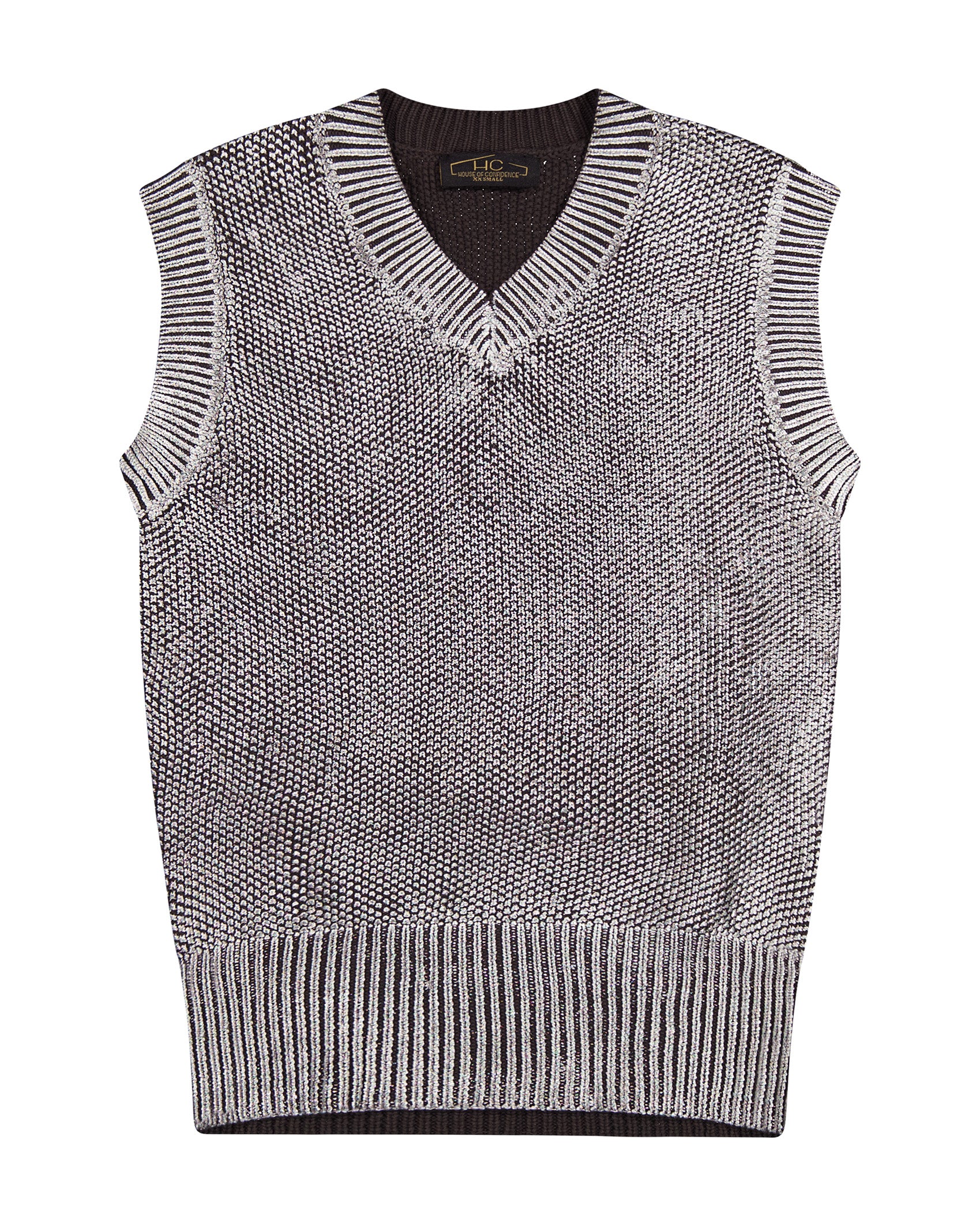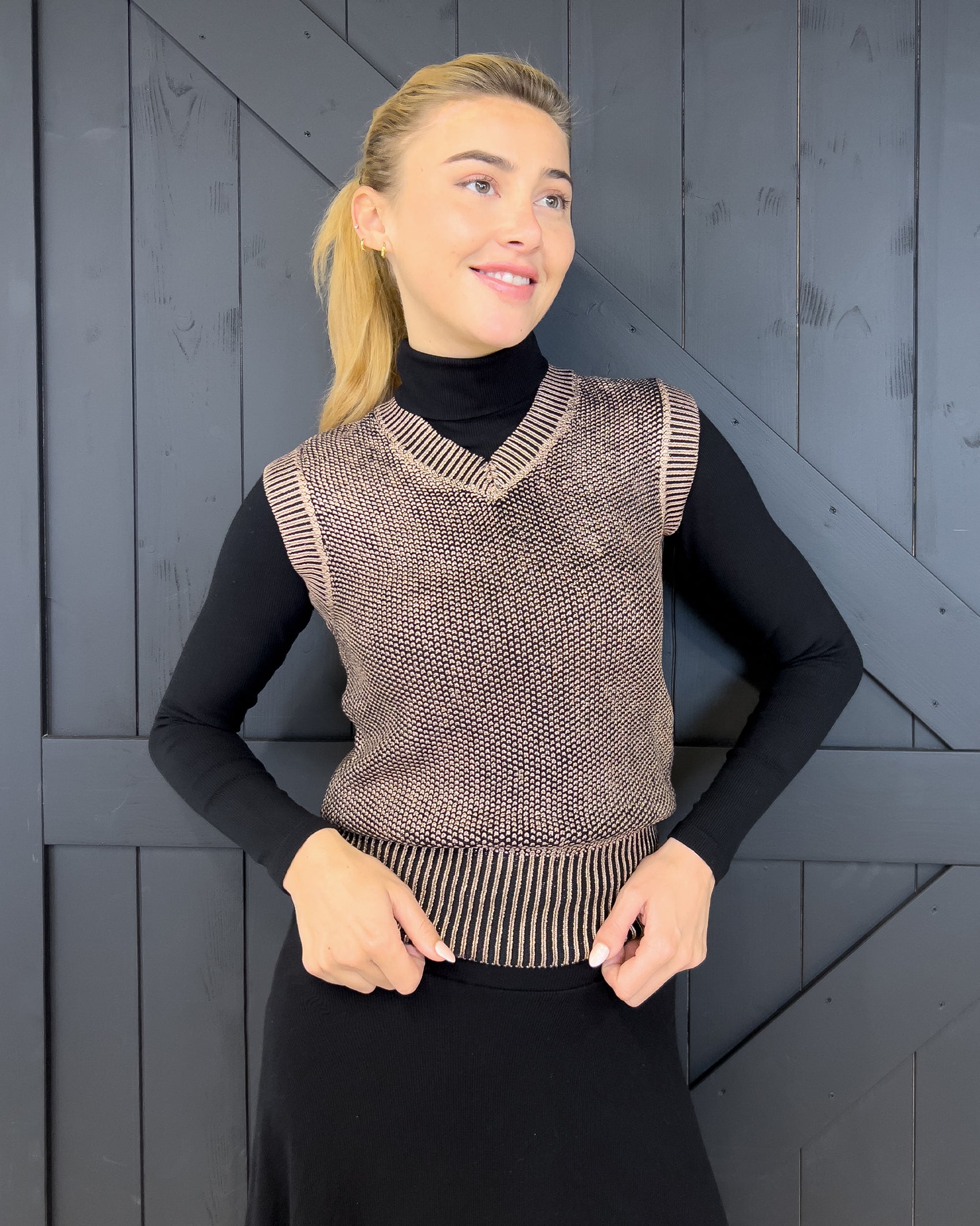 This textured knit vest features a subtle painted finish for a unique, dimensional look. With a ribbed V-neckline, armholes, and hem, it’s a standout piece that layers beautifully over your favorites.