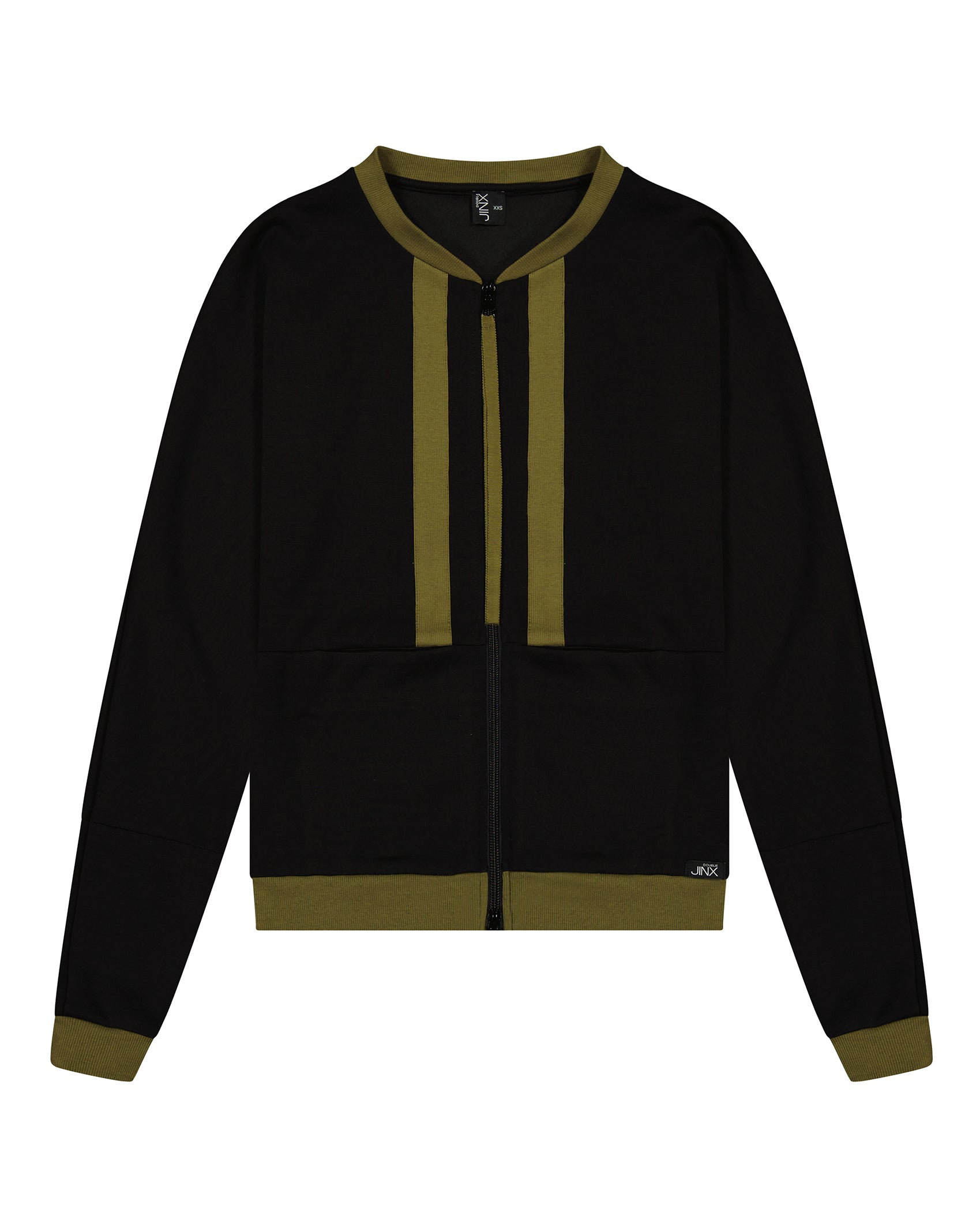 Made from our ultra-comfy scuba fabric, this bomber features contrasting olive ribbed jersey at the neck, cuffs, and hem for a clean finish. A zip-up front and two hidden functional side pockets make it effortlessly practical. Olive stripes run down the chest, with a grosgrain ribbon detail placed across the upper back for a unique finishing touch.